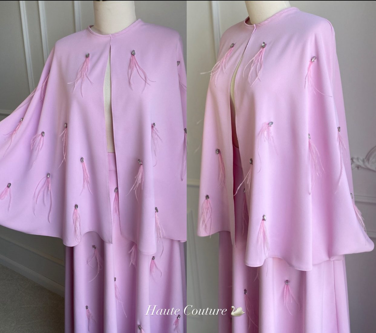 Tüy ve kristal detaylı pembe pelerin